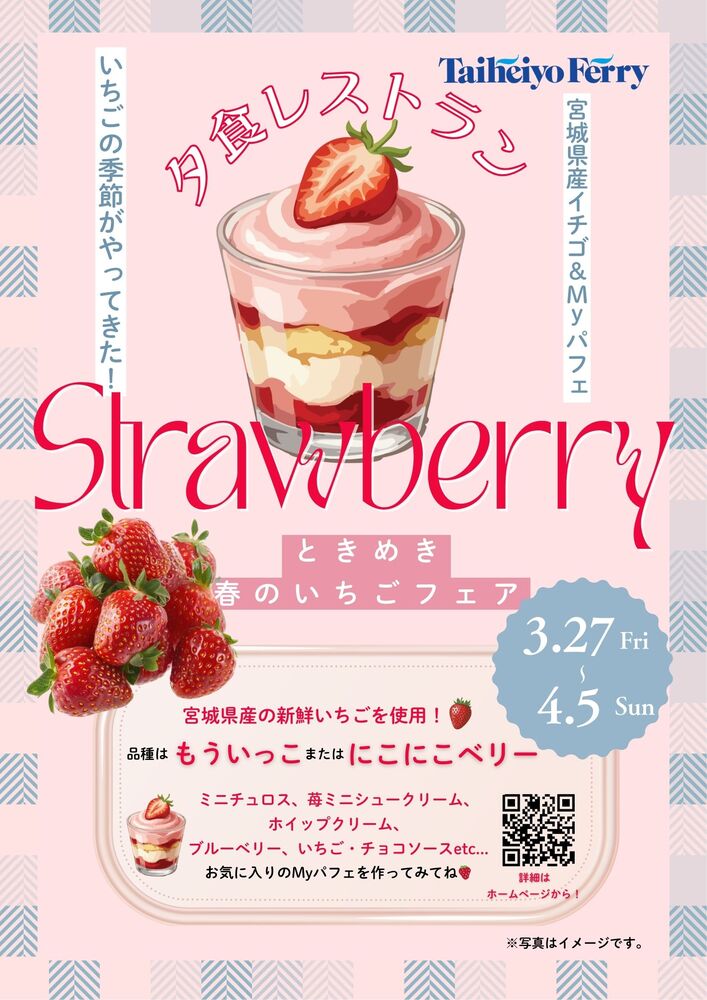 15年分の心からの感謝を込めて、期間限定で船内レストランのディナーバイキングにおいて、「ときめき 春のいちご(15)フェア♪」を開催いたします。